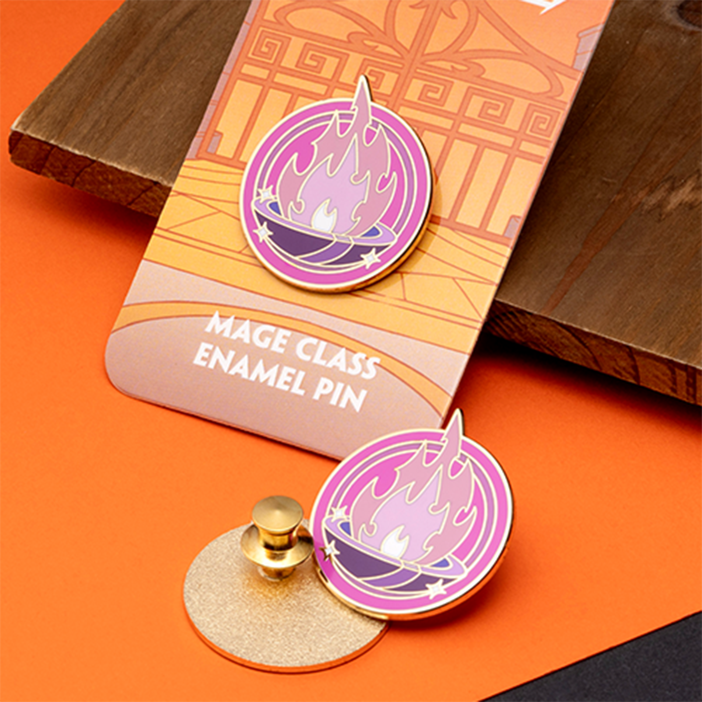 All of the pins were delivered attached to a custom cardstock with the class designation and custom design to serve as the backdrop. Custom cardstock is often used for custom video game pins and for custom merch because it adds to the design, gives retailers an easy means of hanging and displaying pins for sale, and helps unify a set of pins as part of a series.