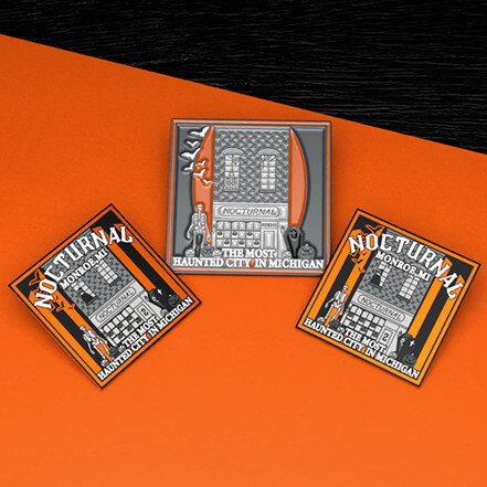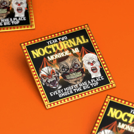 By the second year, Nocturnal Monroe had grown and so had their vision. Instead of creating another set of multiple characters, they launched two designs that told a bigger story. The first was Nocturnal Misfits, a circus-horror inspired pin featuring three sinister clowns framed under the big top with the phrase “Every Misfit Has a Place Under the Big Top.” The second was Haunted City, a tribute to Monroe itself that depicted a haunted building and proudly declared the town “The Most Haunted City in Michigan.” These designs marked an evolution in style and message, turning pins into a storytelling tool that reflected the brand’s personality and hometown pride.
