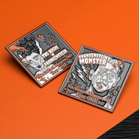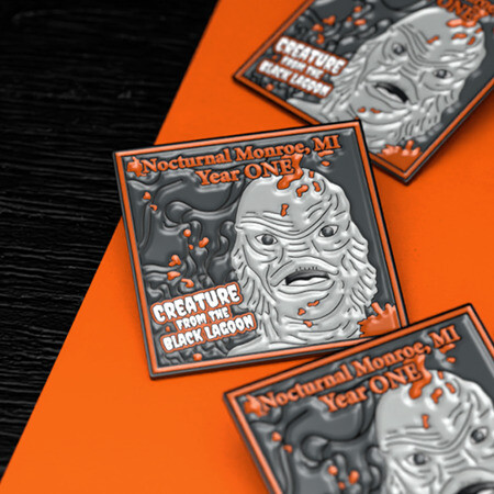 For their first anniversary, Nocturnal Monroe went big with a full pin series inspired by classic horror icons. Each design featured bold linework, a dark and moody palette, and a polished black nickel finish that made the details shine. The collection brought to life the Bride of Frankenstein, Dracula, Frankenstein’s Monster, the Mummy, and the Creature from the Black Lagoon. Stamped with “Nocturnal Monroe, MI – Year ONE,” the series quickly became a limited-edition keepsake. Fans loved the nod to horror history and the pins gave them a tangible way to connect with the shop’s identity.