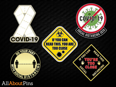 All About Pins can work with you to create a lapel pin design that is unique to you and your business, that reminds everyone to socially distance and maintain that 6 foot perimeter. Something as simple as an awareness ribbon lapel pin, or your company logo and the phrase “Social Distancing 2020” would work. Our graphics team had the witty idea of an awareness ribbon lapel pin that reads “If you can read this you are too close”.