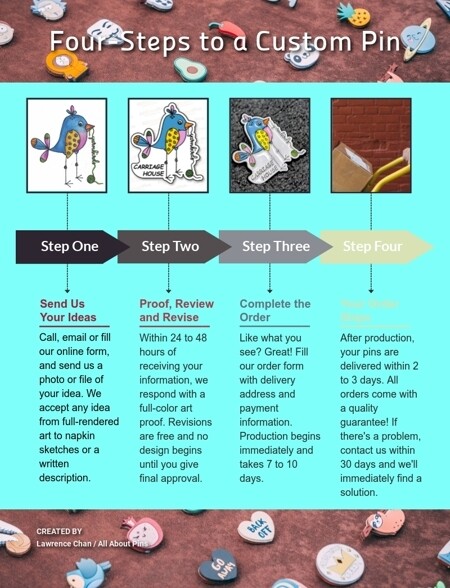 Got artwork or logo you want made into a custom lapel pin? Never ordered custom pins from a company before? We’re All About Pins here and ready to help you through the process of designing and ordering custom lapel pins for your business, organization, sports team or online shop using our four-step process. This article will help guide you through our design and ordering process that takes your concepts and executes them into high-quality lapel pins.