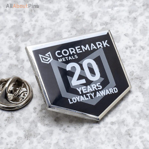 Die struck pins get their name from the custom die (also referred to as a “mold”) machined of your design. This die is used to strike (or stamp) your design into the base metal. The pins are then cutout from the base material, plated, and have their attachment mechanisms attached. Because there’s no painting for this type of pin, custom die struck pins have the quickest turnaround and can be the perfect solution for a short deadline or rush project. We can make die-struck pins in all of our high polished and antique finishes. Sandblasting and antiquing your plating option can create visual contrast in a custom pin design without taking away from the classic aesthetic. For designs with lots of text, we always recommend antiqued designs for legibility and clarity. Our custom die struck pins are especially popular with designs for service award pins and years of service pins.