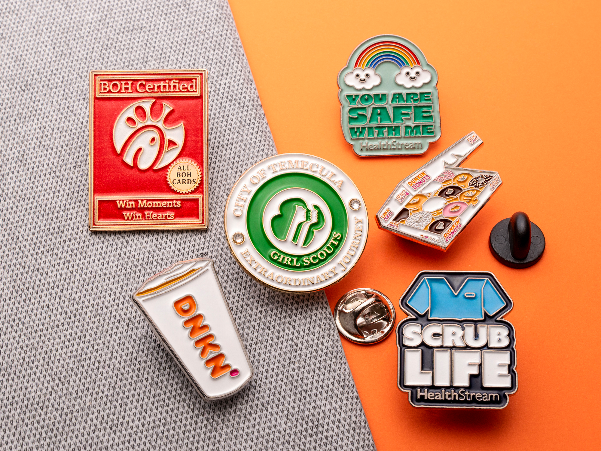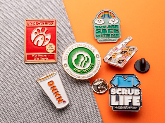 Custom soft enamel pin uses vary as much as their appearances do. We regularly make collectible enamel pins for corporate uniforms, career milestones, and employee recognition. We also make custom enamel pins for brand, product line, new movie, book, and graphic novel launches. Artists (both musical and graphic) also favor custom soft enamel pins to showcase their logos and artwork.