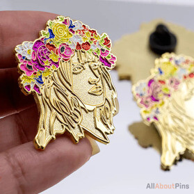 This contrast creates visual depth and a striking design. This feature is one of the few things that all soft enamel lapel pins have in common. They come in all shapes and sizes and can vary from small and simple to 7" wide and elaborate with crazy shapes and upgrades like cutouts, 3D molds, rhinestones, translucent paint, LED blinkers, glitter, and more.